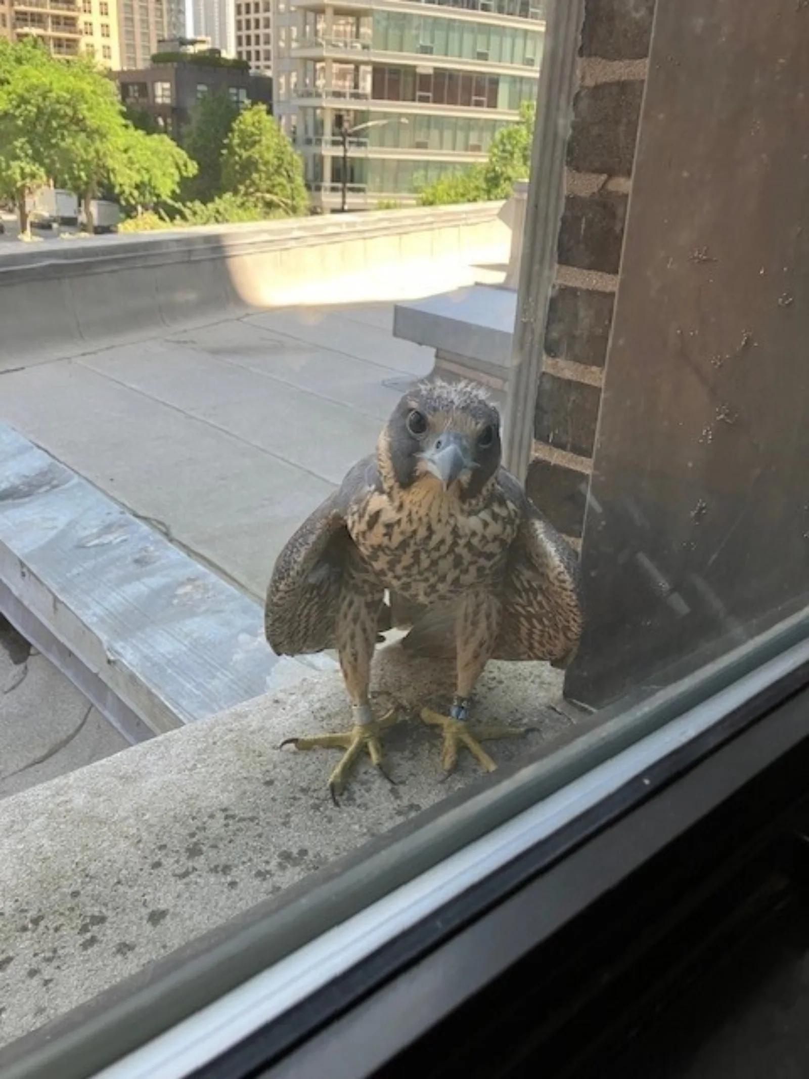 It was a terribly hot day, and the falcon looked a bit exhausted, its eyes were blinking, and it was breathing heavily. There were metal bands on its legs, indicating it was likely part of the Chicago Peregrine Program, which for years has worked to protect and monitor the species. I messaged the program on social media and quickly received a reply. Our visitor was a young falcon named Lizzy, hatched this year, and likely was making one of her first flights away from the nest. Everything we were observing was typical of a healthy juvenile, and her parents were likely nearby. Around the same time, Kristin observed an adult bringing Lizzy a meal in the form of an unfortunate yellow-billed cuckoo.