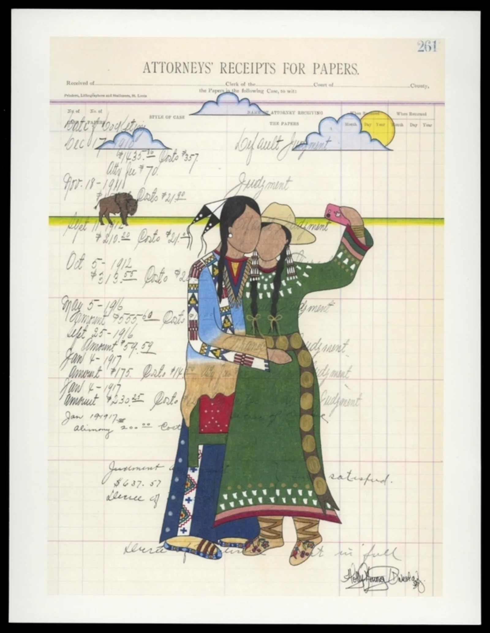 In the past fifty years, a revival of ledger art has been led by contemporary Indigenous artists. Dakota artist Holly Young combines traditional mediums – Northern Plains style beadwork and quillwork, in addition to ledger art – with contemporary vision and inspiration. Based in Bismarck, North Dakota, Young uses pen, ink, and colored pencil on paper removed from ledger books dating from the nineteenth and early twentieth centuries to depict contemporary experiences. Young’s work, and others, is included in our current exhibition, Native Pop!.