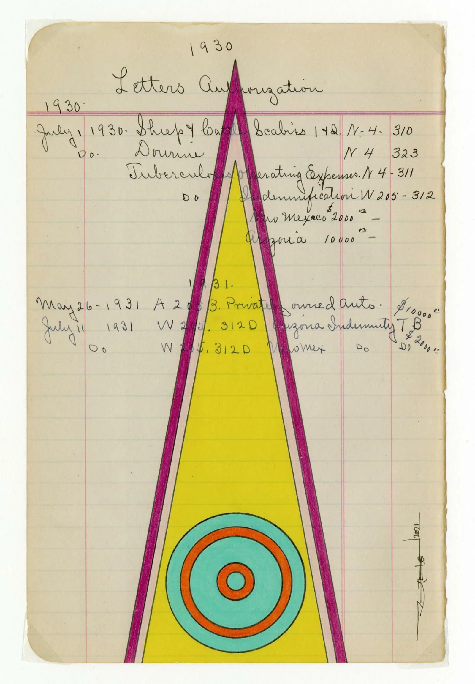 In the wake of the near-extermination of the bison herds in the mid-nineteenth century, the lined pages of ledger books became favored places on which to document Native life. Compact and portable, ledger books were among the most common sources of paper on the Plains, traded among United States soldiers, agency employees, and missionaries and Native people. Similarly, colored pencils, watercolors, ink, and crayons became more available at this time. Ledger art thus refers to the adaptation of traditional means of recording history on animal hides to paper.