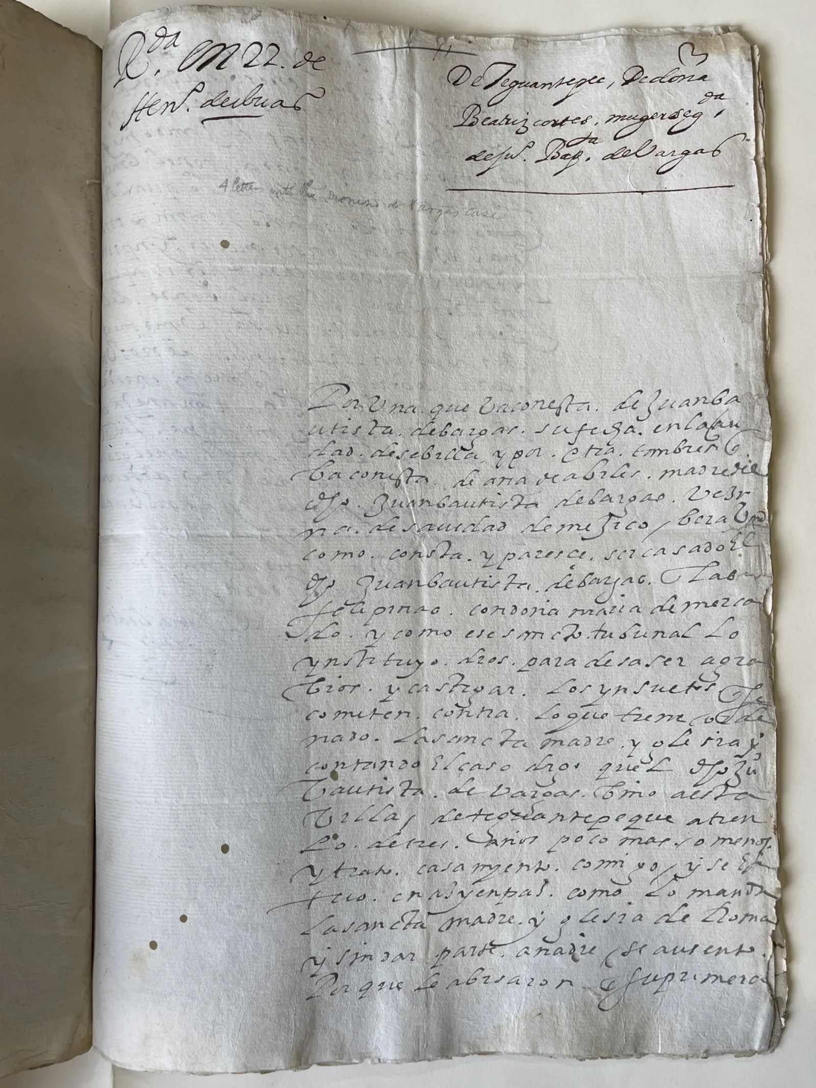 From what I have been able to gather, Dionisio de Vargas had been living in Manila with his wife, María de Mercado, before traveling to New Spain, the colonial viceroyalty that included present-day Mexico and Central America, on his own. While living in what is now Guatemala, he received news by word of mouth that María (who was still in the Philippines) had passed away. He remarried and shortly after learned by way of a letter from Manila that María was still alive. Included in the documents are testimonies from witnesses (including Dionisio himself), sentencing documents from Rome, and correspondence between Dionisio and Beatriz (his second wife) and Dionisio and his mother. What seems to be missing is the letter from Manila. Additionally, what is of most interest to me is that María’s voice is completely absent from the archive and her existence is merely alluded to.